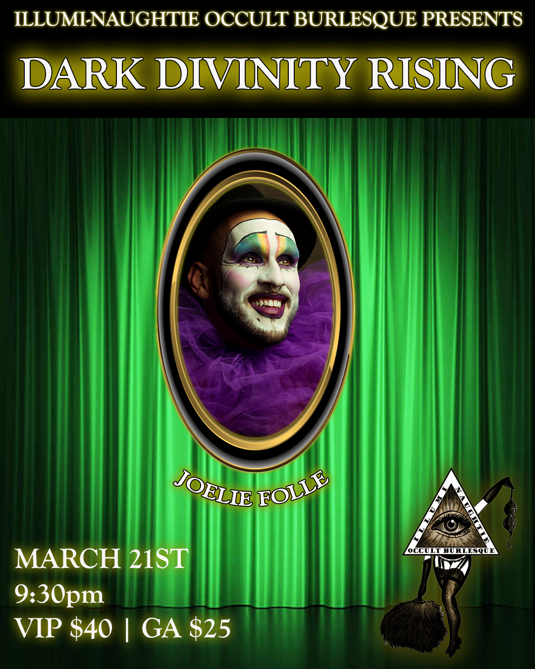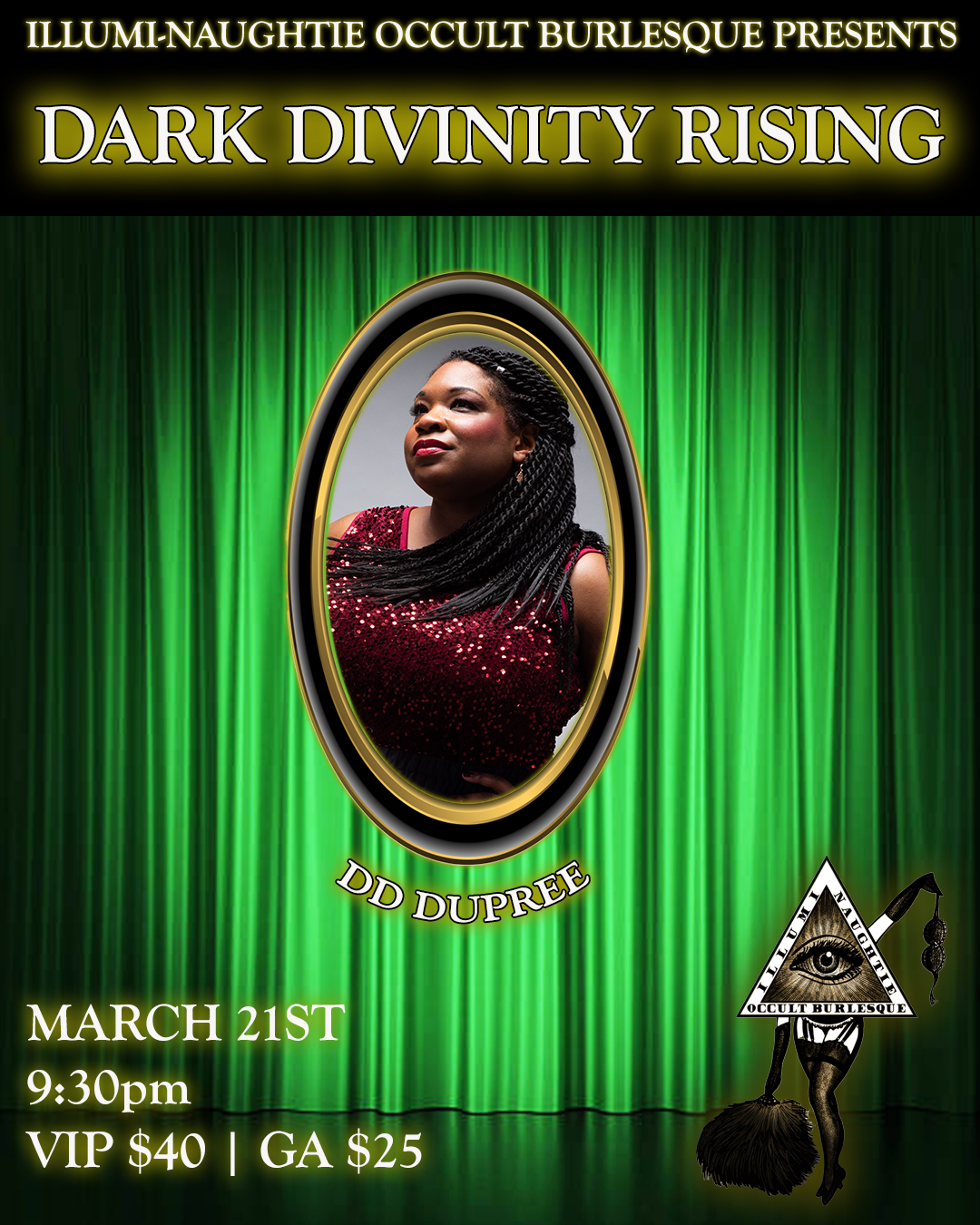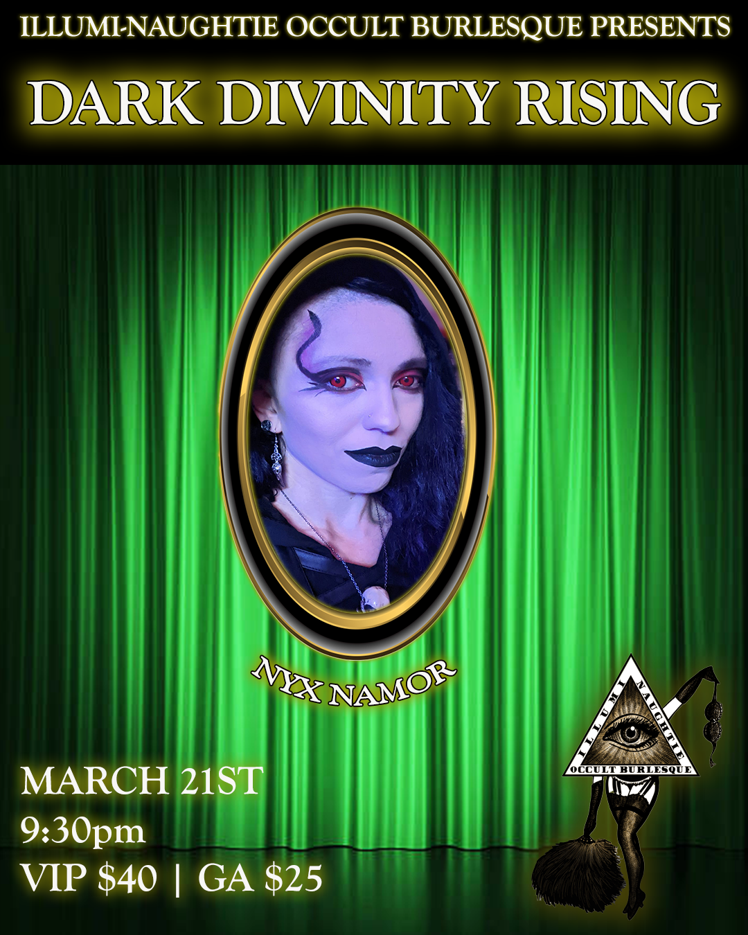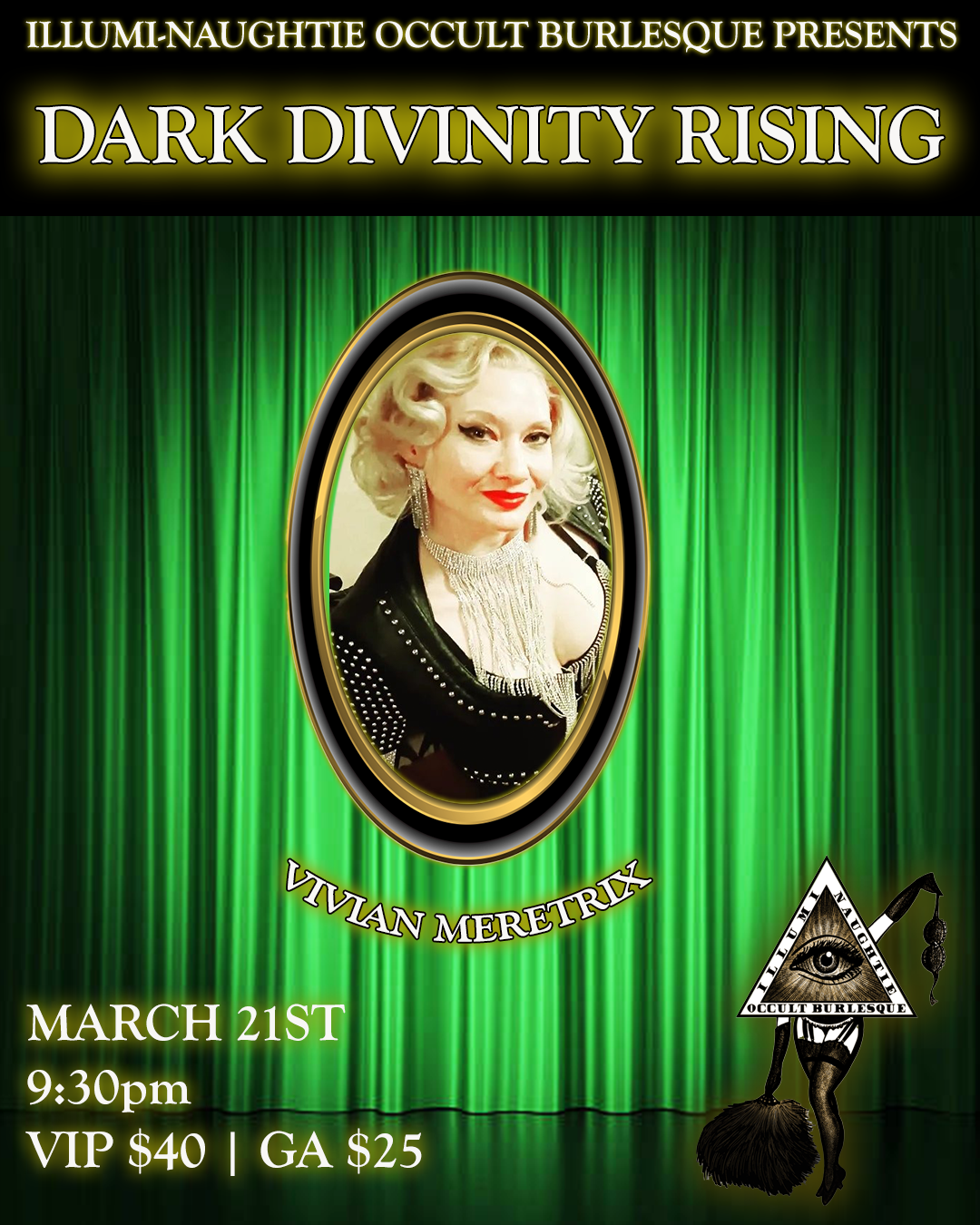 The Illumi-Naughtie Occult Burlesque presents an evening of delicious devotions to the dark deities! Celebrating the Spring Equinox and the re-emergence of the dark goddesses from the underworld, Illumi-Naughtie Occult Burlesque dedicates its stage to initiation and transformation. We will call on the power of divine retribution and protection with the help of Miss Nyxon, Vivi Valens, Morteisha Addams, Vivian Meretrix, Joelie Folle, Nyx Namor, and DD DuPree! Worship our marvelous manifestations of Sekhmet, Xochiquetzal, Qetesh, Freya, Hermes, An Morrigan, and Oshun.